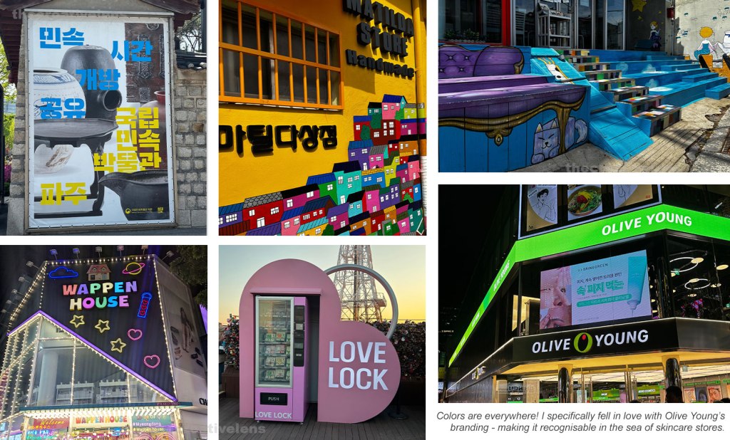 Korean color spectrum – bold and bright – another significant characteristic of Korean design. While the overall Korean design style is modern and global, the influence of Korean traditional folk art, especially for colors, is heavy on the contemporary design – making it a perfect interplay of cultures and timelines. Traditional Korean art, particularly folk paintings known as ‘minhwa,’ often features bold colors and stylized, flattened perspectives. The paintings, known for their focus on conveying emotions than the art technique, used the traditional colors of the ‘obangsaek’ (white, black, blue, yellow, and red) representing the five elements and directions. While these traditional meanings may not always be directly referenced in modern design, the historical precedent of using a vibrant and symbolic color palette has undoubtedly contributed towards bold chromatic expression. The bold colors aren’t limited to graphic design, even the structures like Busan’s Sky capsule with red, yellow, green, blue capsules carry the vibrancy of the palette. I mean the world today needs color, more than ever.